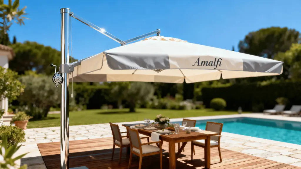 Son bras puissant maintient sa toiture estivale en hauteur, bien au-dessus des tables. Son mât excentré permet de profi ter de tous vos convives attablés. Le parasol protège du soleil journalier, grâce à un système ingénieux permettant de le faire pivoter de 360°, sans déplacer la base de ce dernier.