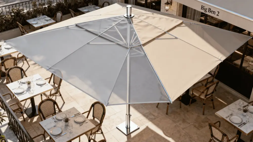 Le parasol géant Big Ben attire tous les regards. Majestueux et élégant, il se remarque de loin. Sa grande taille permet d‘ombrager une importante surface.