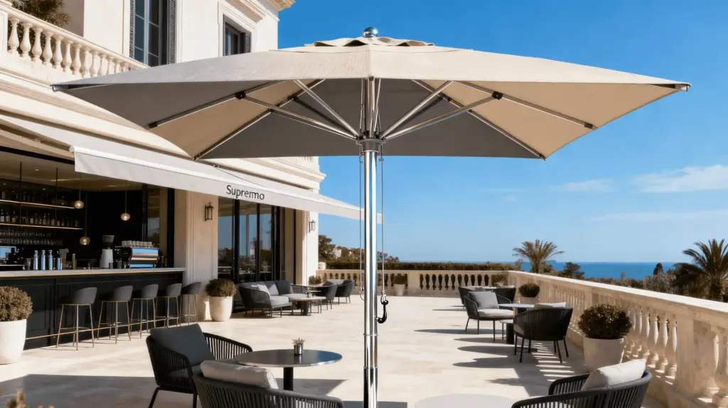 It’s so easy – avec son astucieux mécanisme coulissant, le parasol Supremo s’ouvre et se ferme beaucoup plus vite que les autres parasols. Un petit geste suffi t – le parasol s’ouvre presque tout seul grâce à son système équilibré. Même avec un diamètre de 6 mètres, il s‘ouvre et se ferme sans effort. Ceci présente un avantage incontournable pour les professionnels de l’hôtellerie mais également dans le secteur privé.